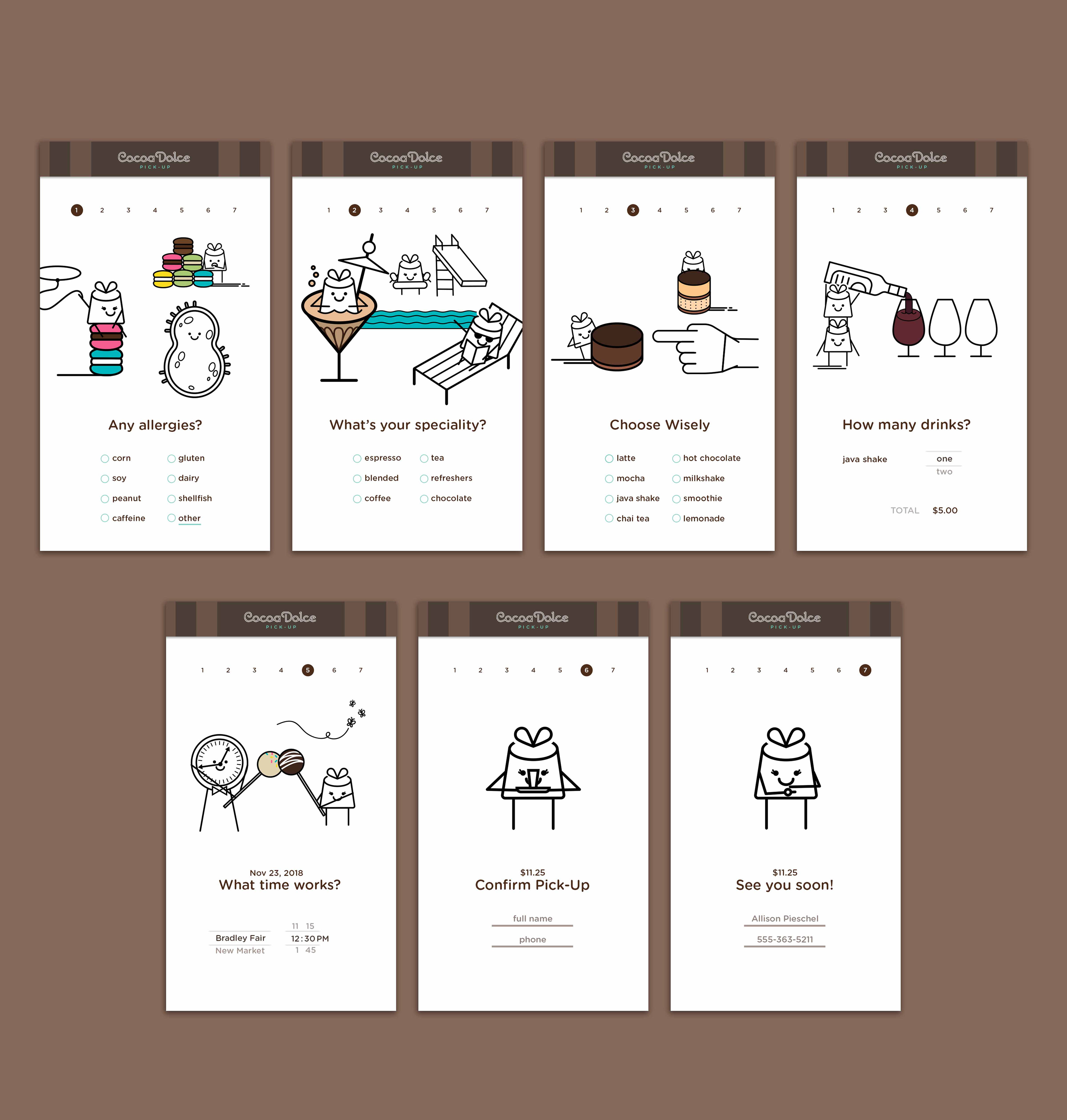 This microsite incorporates fun, interactive chocolate characters that guide you through the ordering process for drinks, using line elements from Cocoa Dolce.